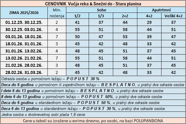 - RESORT VUČJA REKA & SNEŽNI DO - 2025/2026 (članovima SkiBus-a obezbeđen popust na usluge i na zvaničan cenovnik).