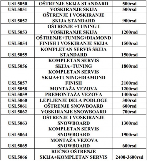 CENOVNIK USLUGA SERVISA SKI OPREME