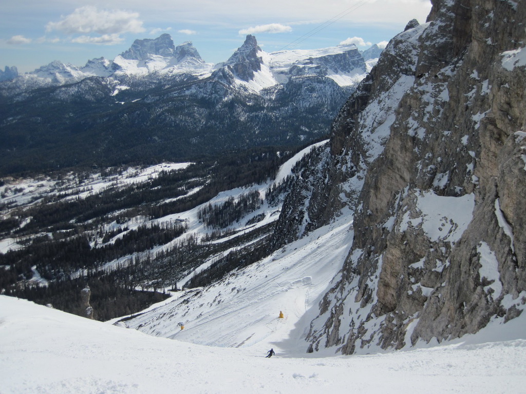 Faloria / Cristallo je skijalište koje se nalazi ispod vrha Cristallo na 3.216 mnv. I do ovog skijališta vodi velika gondola iz samog mesta, koja prevaljuje visinsku razliku od 900m do vrha Faloria na 2123m/nv. Ukupno 35 km, uglavnom crveno-crnih ski staza ovog skijališta, namenjane su takođe, pre svaga dobrim skijašima. Treba obratiti pažnju na nekoliko odličnih crnih staza - Canalone Franchetti, Stratondi i Vitelli. Većina ovih staza se spušta ka putnom prevoju Passo Tre Croci. U blizini je i odvojeno skijaško područje Mietres / Guargne sa pretežno plavim stazama ukupne dužine 5 km.